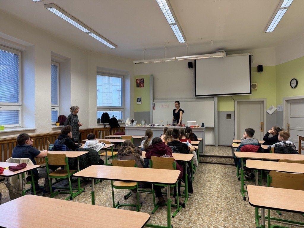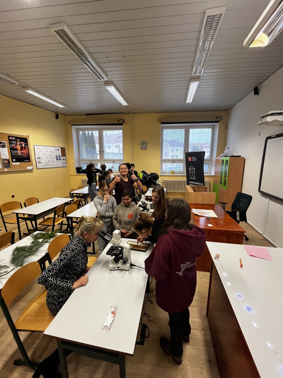 Středeční program pro páťáky ze ZŠ Klášterní a ZŠ Miroslav přinesl nejen sváteční atmosféru, ale také pořádnou dávku vědy. Naše vyučující – Mgr. Lenka Šenfloková a Mgr. Monika Huberová – si společně se studenty třídy kvinta připravily sérii fyzikálních, chemických a biologických stanovišť. Všechna měla jedno společné – vánoční téma spojené s objevováním světa kolem nás.