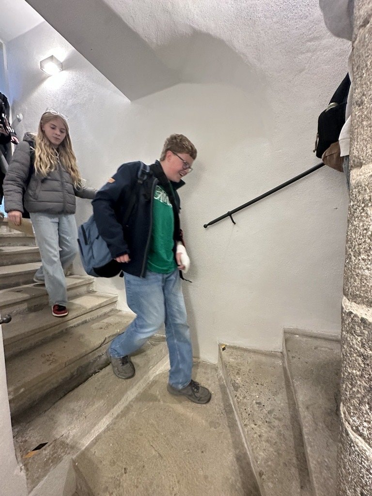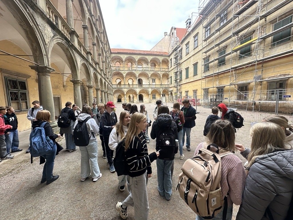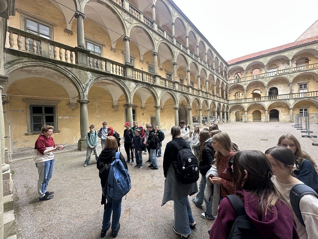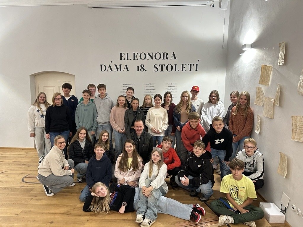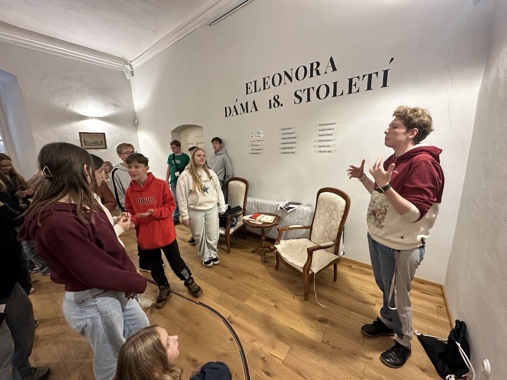 Třída prima dnes měla jedinečnou příležitost vydat se na cestu do 18. století a blíže poznat život a dobu kněžny Marie Eleonory z Lichtenštejna. V prostorách krumlovského zámku na ně čekala interaktivní výstava „Eleonora: Dáma 18. století“, která studenty poutavým způsobem seznámila nejen s příběhem této významné osobnosti, ale také s dobovými zvyklostmi a kulturou tehdejší šlechty.